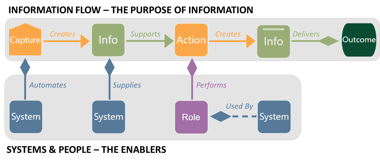 LINQ is an Information Flow Modelling platform. The Information Flow Model was invented by LINQ in order to model the enterprise in a way that informed both Business Leaders and Technology Teams. The LINQ model is shown here: